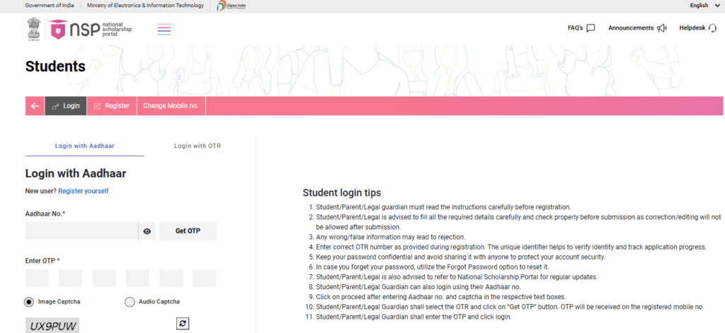 • STEP 4: A new page will appear on your desktop screen the students must enter their mobile number and OTP that they have received on the registered mobile number.