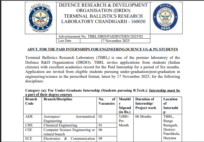 - The DRDO TBRL Chandigarh Internship 2025 is for Indian students who are studying B.E./B.Tech, M.E./M.Tech, or M.Sc. in engineering or science. To get this internship, students must, Study in a recognized (approved) Indian college/university,Have at least 7.5 CGPA, Be within the required age limit. The internship is for students who are doing a full-time degree, and the internship period is six months.