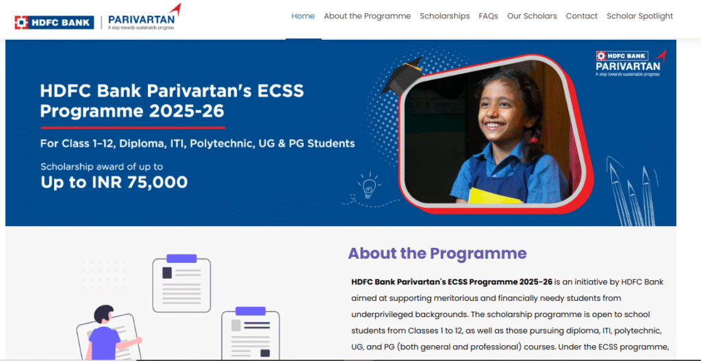 The HDFC Bank ECSS Parivartan’s Scholarship 2025-26 is launched by the HDFC Bank to help the students who drop their study due to financial problem. The HDFC Bank provide the financial assistance to poor and needy students who can’t pay their school or college fees. The students in class 1st to 12th as well as who pursuing ITI, Polytechnic Diploma and UG, PG courses will apply for this scholarship. The students who are facing problem in study and take drop because of their family issues or money crises, they can take financial benefit upto Rupees 75,000 to support their education without any problem. Under this scholarship many students get benefit and now again HDFC bank give opportunity to new students to get benefit. Under this article we provide you all necessary information about the HDFC Bank ECSS Parivartan’s Scholarship.