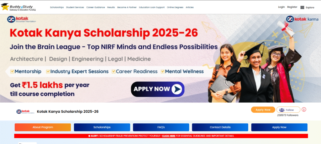 - STEP 1: All the students who want to avail the benefits of the Kotak Kanya Scholarship are requested to visit the https://www.buddy4study.com.
