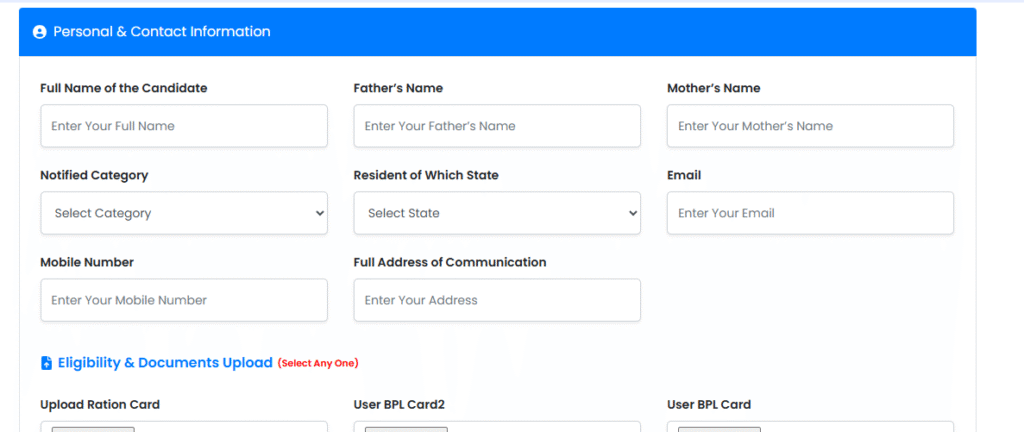 - The Candidate must belong to BPL or EWS and low socioeconomic family from any reserved category notified by the central and all state government.